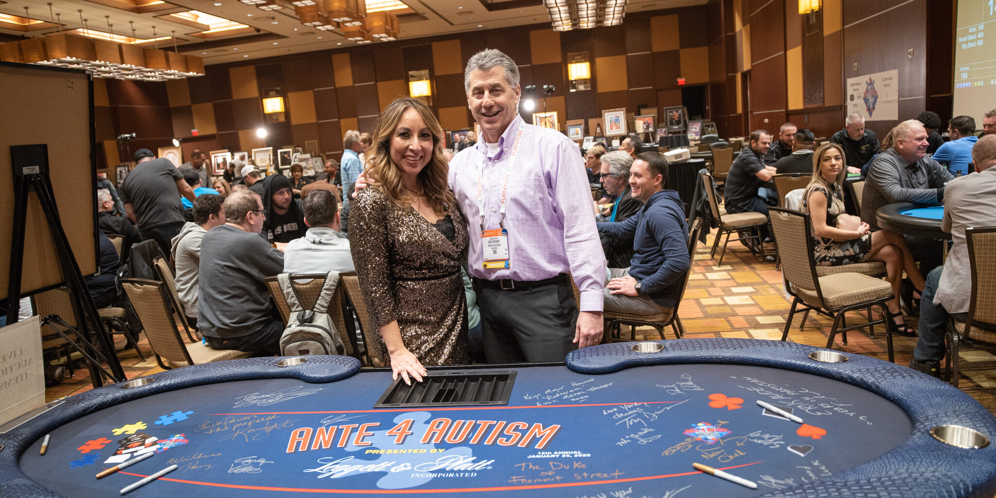 The 13th annual Ante4autism event will be held as originally scheduled Saturday, 1/23/21 at the Golden Nugget in downtown Las Vegas. The Golden Nugget will follow all CDC guidelines for Covid and will require masks for players and attendees as well as social distancing on game tables. (Pictured here at 2020 event: Co-Hosts Karina Jett and Doug Krinsky)